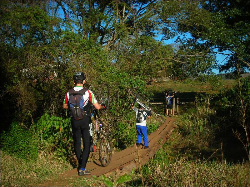 Saímos do centro rumo ao Jardim Monte-Mór e pegamos a radical e maravilhosa estrada do Córrego Fundo, que desce a Cuesta passando por belas paisagens. A estrada termina abruptamente numa porteira metálica. Tivemos que pular a porteira e passar rapidamente na frente da casa da fazenda que há logo depois. Os moradores dali não gostam de visitas. Passamos quietinhos, na moita, e cruzamos a ponte sobre o córrego. Entramos na fazenda vizinha e seguimos pela estrada em meio ao pasto, cruzamos mais duas porteiras e entramos num canavial. A estrada era pura areia e ela me pregou uma peça: atolei da areia e não consegui desengatar o pé do pedal, caí de lado bem na frente do fotógrafo de plantão.
