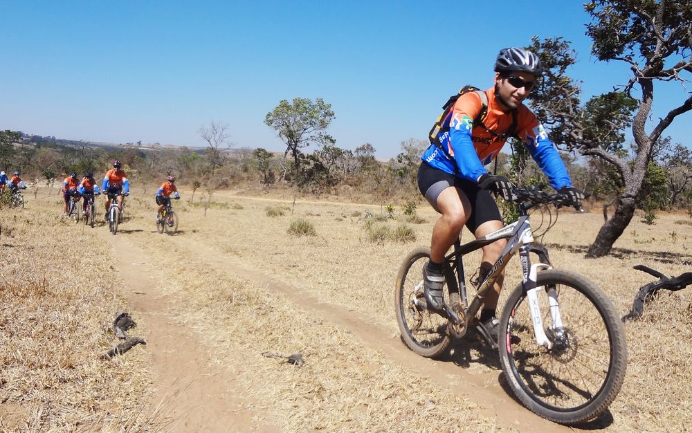 Fomos logo para a parte mais legal, em área de mata fechada, com várias pontes e plataformas de madeira. Ali foi realizada, meses antes, a Copa Formosa de MTB. Uma das curvas, se feita em alta velocidade, levaria o ciclista a um inevitável mergulho no rio, a contragosto. A curta trilha na mata terminou ao lado de uma porteira, após a qual havia uma ponte e uma dezena de vacas nos olhando curiosas. Quando a galera chegou, pulamos a porteira, cruzamos a ponte e fomos para a parte sofrida da trilha, em meio ao cerrado.