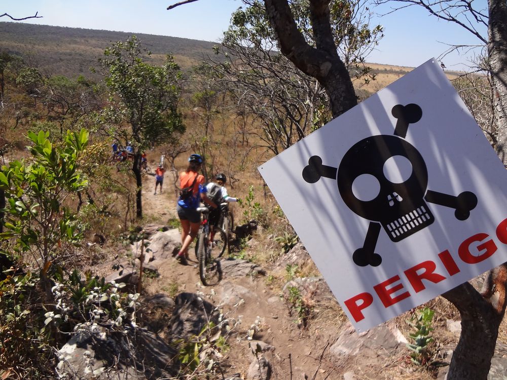 Subimos curta ladeira e entramos em pastagem. Passamos por uma represa de águas verdes sujas, quase vazia devido à seca, e chegamos numa área de cerrado cheia de singles em terreno arenoso com muitas pedras. Pedalar nestes singles foi um pouco difícil devido à areia, mas o pior estava para chegar. Uma placa de caveira, presa numa árvore, indicava o perigo à frente.