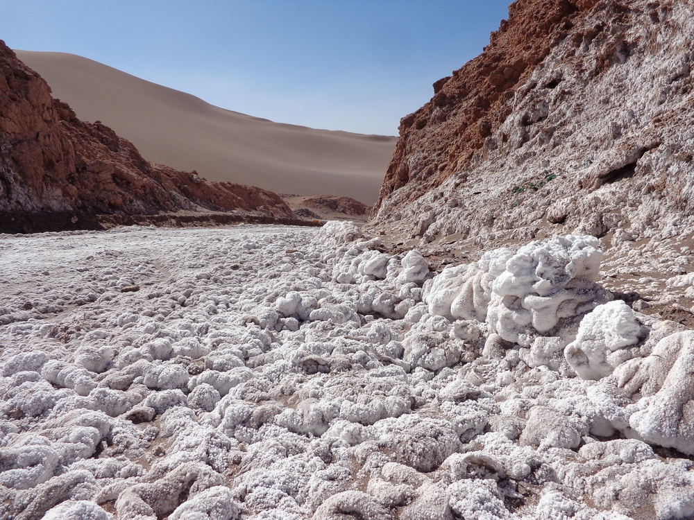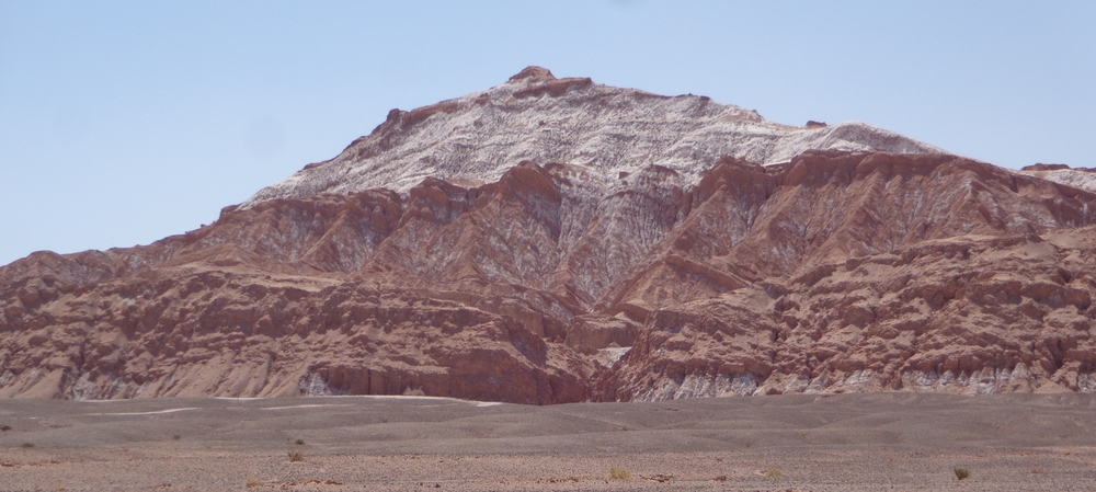 Quase não há vegetação, apenas algumas moitas de capim nativo. É que além de ser solo muito pobre, sem matéria orgânica e sem água, ele é salgado. Montanha ao norte parecia estar nevada, mas na verdade era sal misturado à areia marrom.