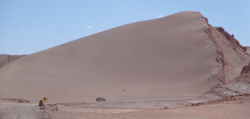 Logo após essa barreira, há uma forte descida. A estrada é coberta de sal e desce ao lado de uma duna gigante.