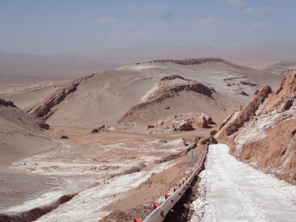 Quem pensou que a diversão havia acabado, enganou-se. Aos 28 km comecei a escalar a Cordillera de la Sal, ou Cordilheira de Sal. Como o nome diz, a areia marrom está misturada com sal. São belas paisagens, muito secas, mas belas, bem diferentes do que estamos acostumados no Brasil. Depois, descendo a cordilheira, locais inusitados, como um grande conjunto de pequenos morros por onde a estrada passou pelo meio.