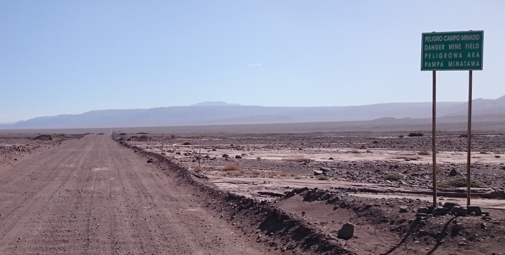 O Chile tem vários campos minados espalhados por suas fronteiras. Eu nem imaginava isso. As minas foram implantadas nos anos 1980, quando o General Augusto Pinochet comandava ditatorialmente o país. O Chile encontrava-se em meio a uma disputa por fronteiras com três de seus vizinhos: Peru, Bolívia e Argentina. Por isso, Pinochet, certo de que uma invasão terrestre era iminente, comprou minas terrestres e distribuiu-as pelo país. Em poucos anos, cerca de 180 mil minas terrestres foram enterradas ao longo das fronteiras do Chile.