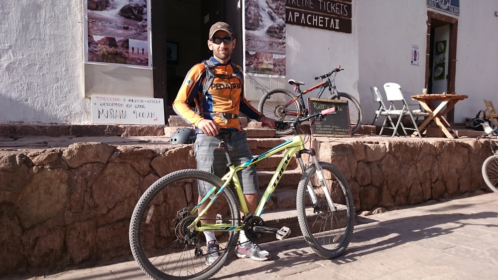 Havia várias lojas que alugavam bicicletas. Apesar de o aluguel ser mais caro, preferi alugar na loja chamada Apacheta, a única que alugava bikes de aro 29. Custou-me quatro mil pesos.