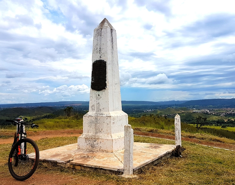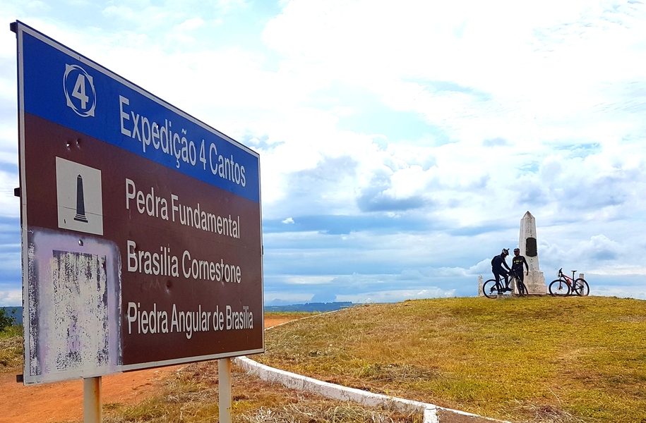 Para sair da área do parque, pegamos single fantástico, descendo até uma estradinha de chão. Chegamos à DF-128, rodovia de terra que segue em direção ao Morro do Centenário. Lá está a Pedra Fundamental de Brasília, marco histórico do Distrito Federal.