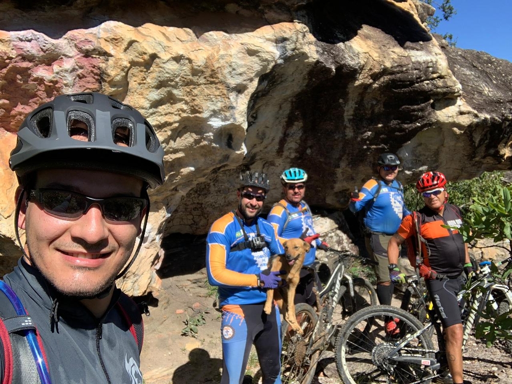 A turma não me deu atenção, mas ciclista de MTB é o tipo de humano que eu mais gosto. Eles são amigos, me dão água e comida. Não tem erro. É só correr atrás e colocar a língua pra fora que me dão água. Às vezes me dão salame, queijo, gel, paçoca. Batata eu não gosto pois me dá gases.