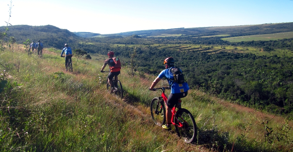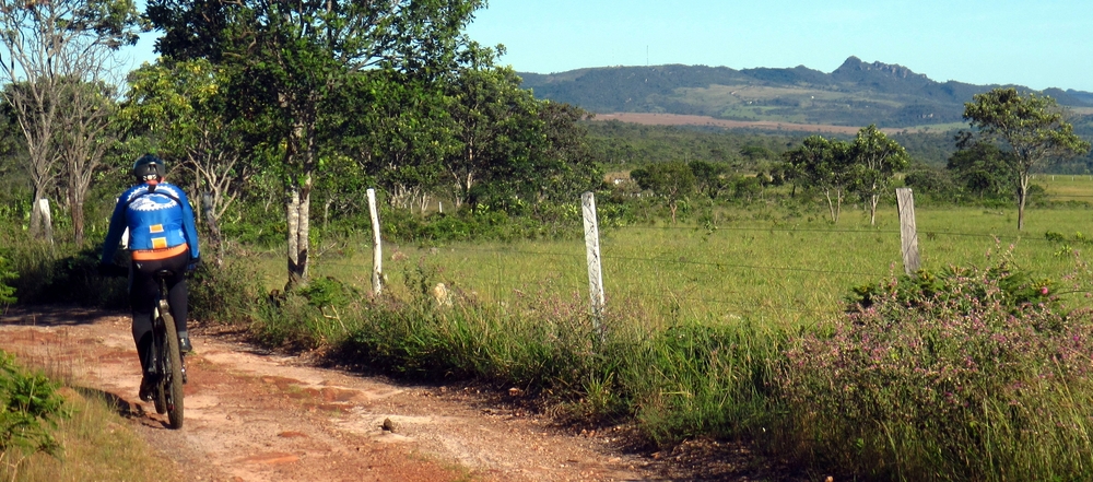 A trilha seguiu entre fazendas. Chegamos ao topo da Serra do Bicame com quase dez quilômetros de pedal. Dali, descemos no sentido de Cocalzinho. O Pico dos Pireneus estava à nossa frente, marcando a paisagem ao longe.