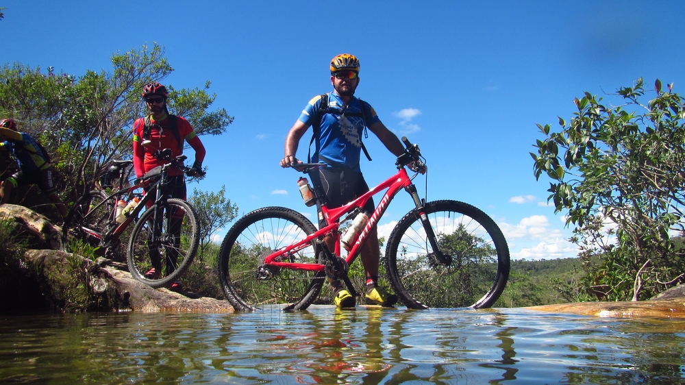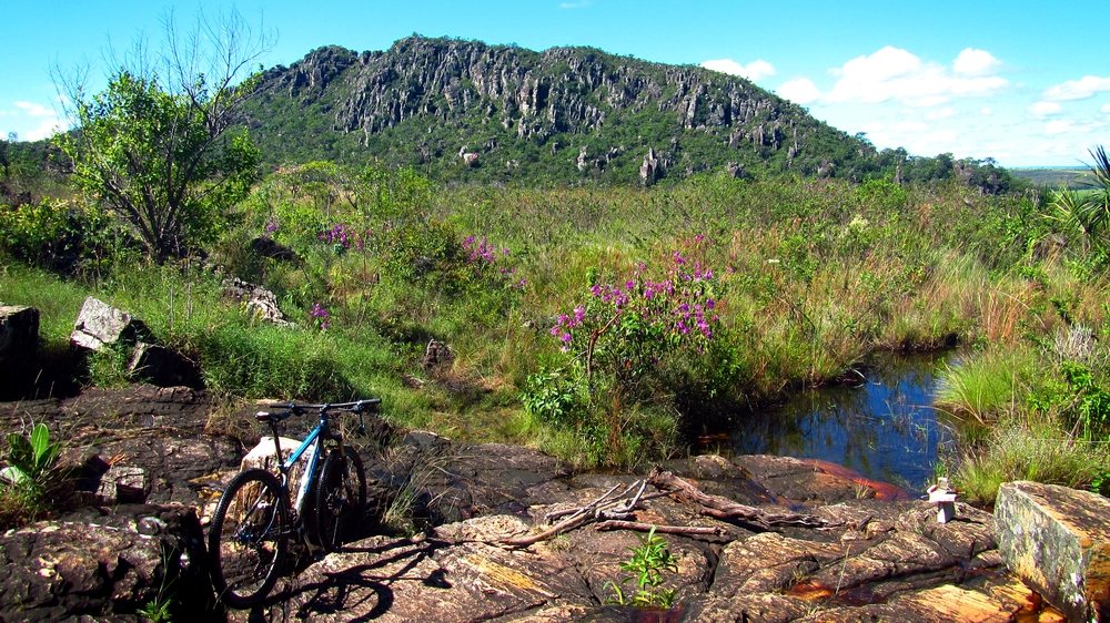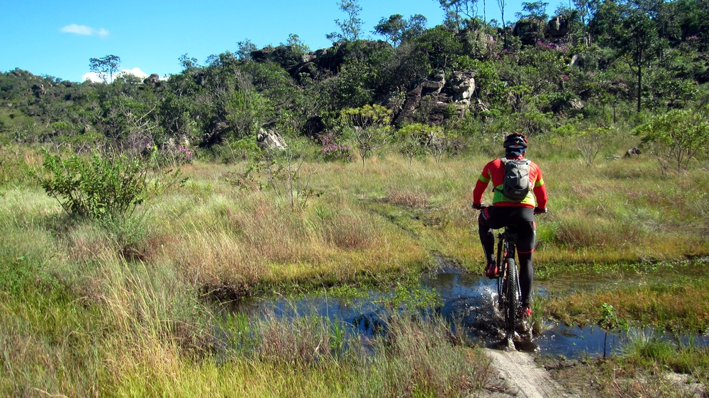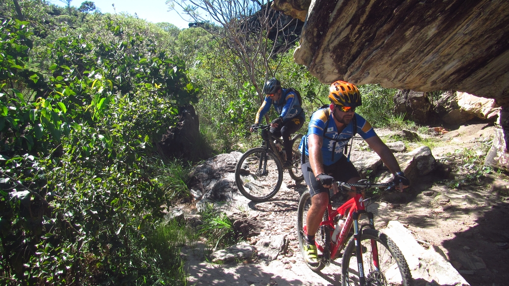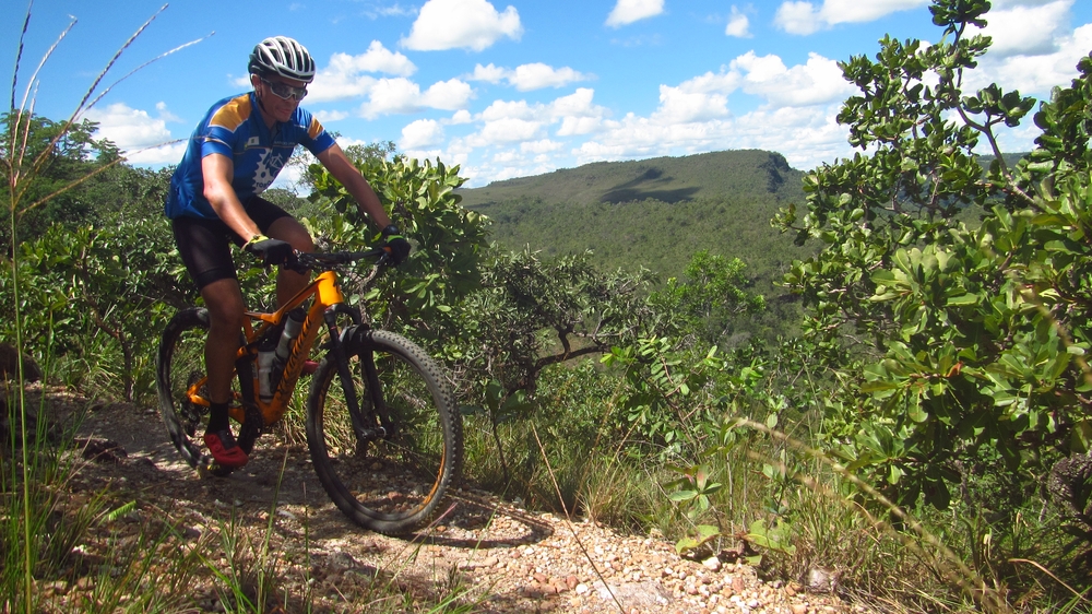Aos 26 km começou o single que atravessa o parque pelo sul. Essa trilha single é fantástica. O começo é travado, ao atravessar um campo rupestre. O solo tem pedregulhos e a todo momento é preciso descer da bicicleta.