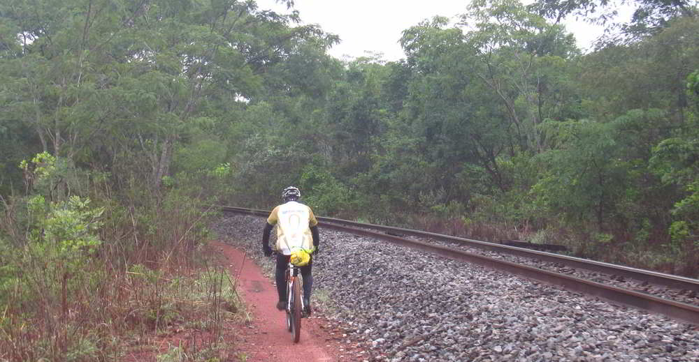 Vencida a pequena ladeira pedregosa para acessar os trilhos, seguimos pelas margens da estrada de ferro por dois quilômetros até sair à direita, entrando no Parque Ecológico Córrego da Onça.