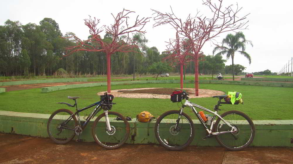 Seguimos pelo asfalto por mais dois quilômetros e Cristóvão quis fazer outra parada 😞. Numa rotatória da rodovia há um monumento com três árvores de ferro vermelhas e havia uma kombi vendendo pastel e caldo de cana. Paramos.