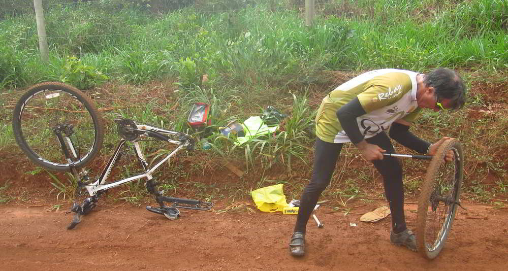 Enquanto Cristóvão tirava o pneu do aro, eu remendei a câmara antiga. Com a pressa, esqueci de lixar o entorno do furo e fui logo passando cola. Putz! Vai soltar, pensei. Mas já não havia o que fazer. Colei o remendo, recolocamos a câmara, enchemos e seguimos. O remendo aguentou.