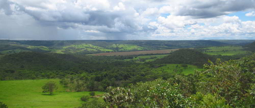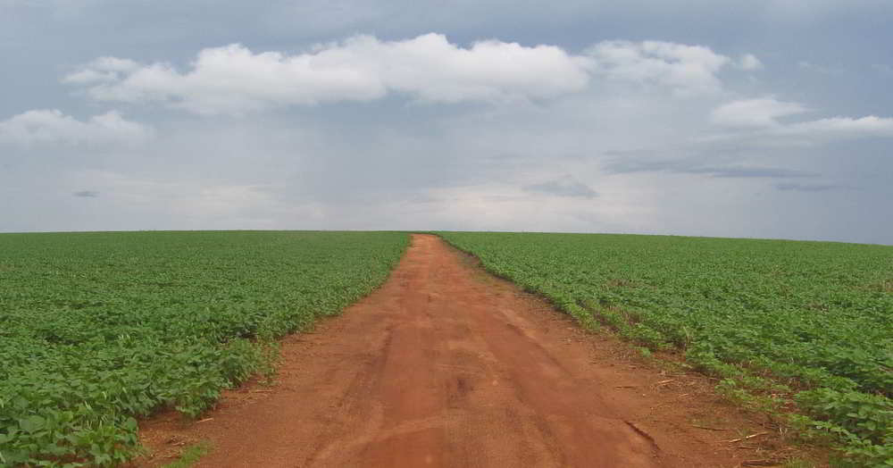 Nosso caminho continuou pelo alto da Chapada Pamplona. Em nossa volta, muitas lavouras. Onde antes havia cerrado, agora há soja, milho, sorgo, pastagens. Em alguns lugares não se vê uma árvore, paisagem desolada.