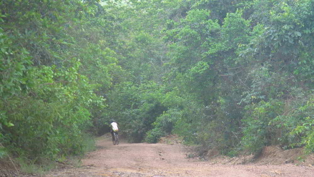 Cruzei os Tonéis na ponta dos dedos, tentando não escorregar em suas trilhas de barro. Nessa época do ano, brota água para todo lado que se olha e além de as trilhas acumularem água em suas poças, ficam bem lisas. Atravessei dois riachos a vau antes de alcançar o asfalto que me levou à EPIA, onde cheguei às 5h40. Cristóvão já estava lá, parado sob um pequizeiro, ao lado de uma barraca que vende cocos. Veio pedalando desde a Asa Sul. Em sua bike havia lancheira infantil amarrada no bagageiro de canote e bolsa de guidão.