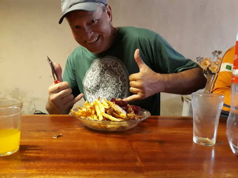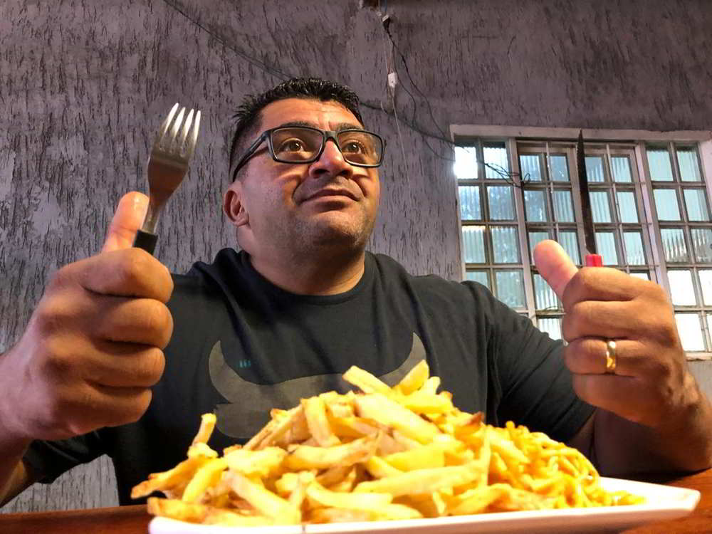 A turma estava bebendo cerveja e a maioria já estava de banho tomado, só esperando para partir. Eu fui logo almoçar, sendo acompanhado por Marcão, Emídio, Dalton e Rafa Kobe. Rafa aproveitava cada nova rodada de almoçantes para comer mais um pouco. Segundo relatos, foi a sexta vez que ele almoçou. Não sei onde cabe tanta comida num homem tão magro. Os pratos dos colegas Marcão e Emídio impressionaram-me. Emídio ficou escondido atrás do seu.