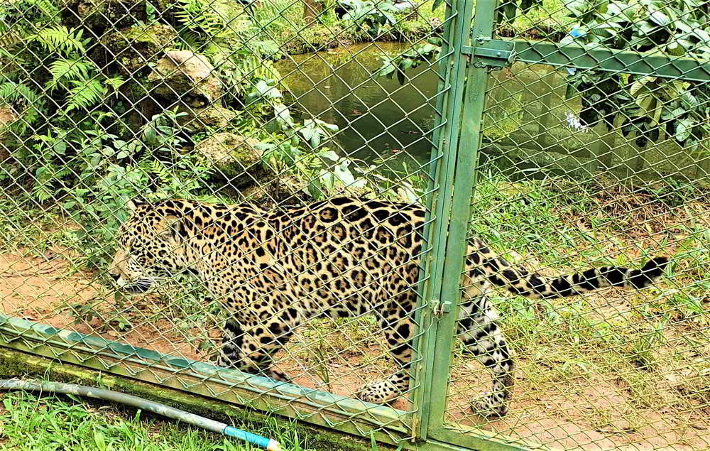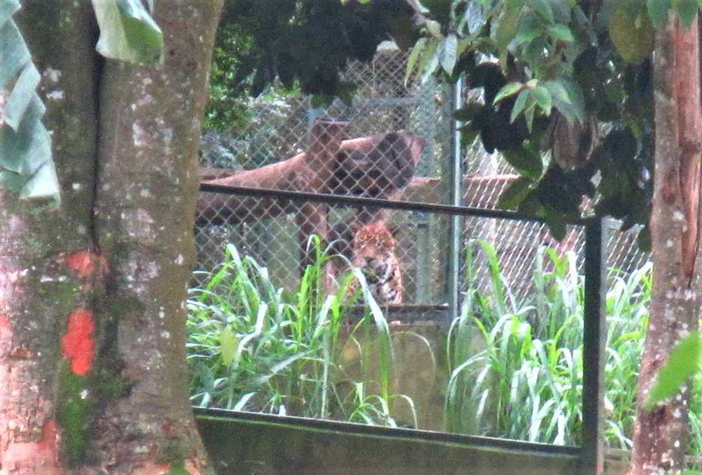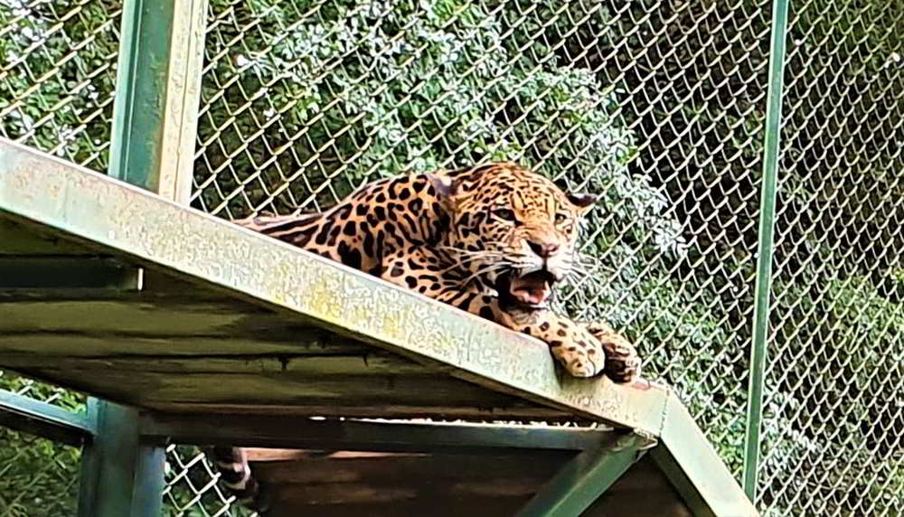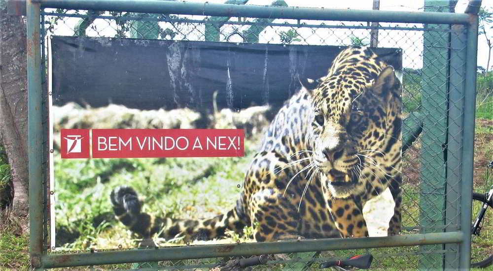 Ao passar por um córrego, Fernando e João Campos avisaram-me: “Olhe aí as grades do NEX.” Parei e tentei enxergar alguma onça ali da estrada. Quando avistei uma onça pintada, ela já me encarava. A cerca de 20 metros da estrada, dentro de um jaula, ela observava-me atenta.