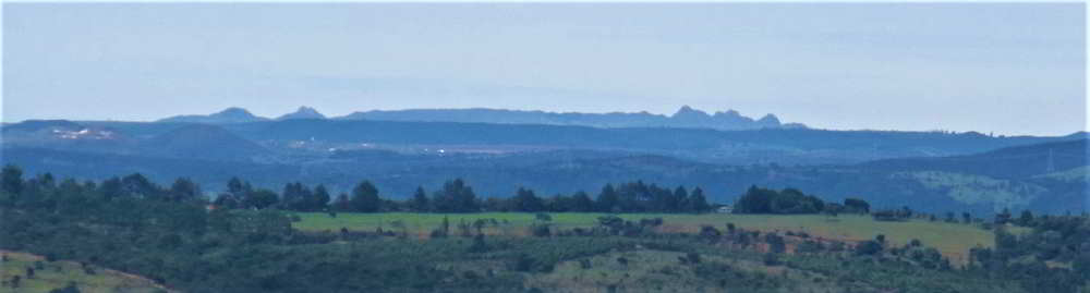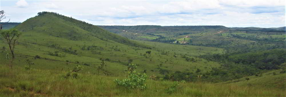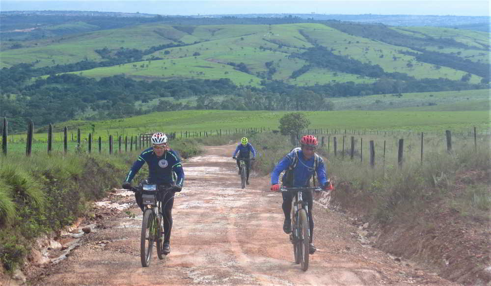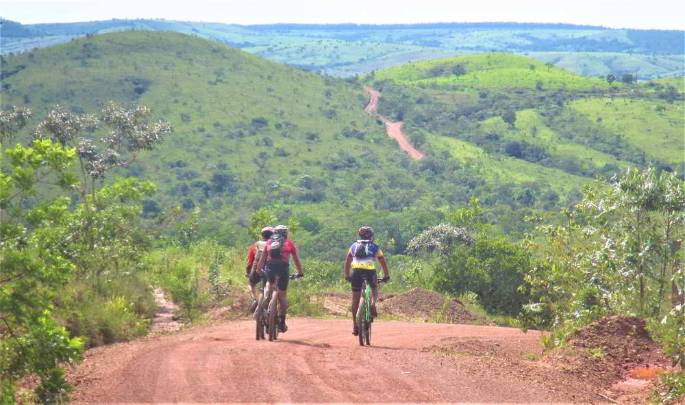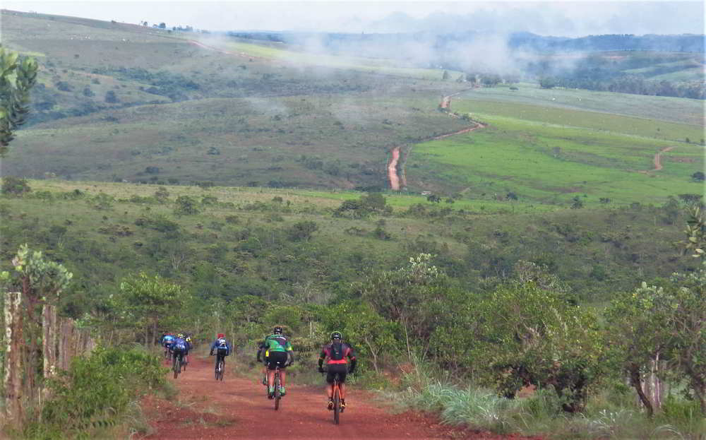 A trilha seguiu pelo norte da BR-070, por estradas de terra. Dali era possível avistar a Serra dos Pirineus ao longe.