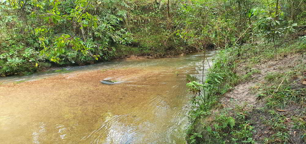 Os últimos vinte quilômetros, desde a parada na fazenda, segui sozinho. Chegar à borda sul da Chapada Pamplona é um alívio, sinal de que falta pouco para terminar a trilha. A descida acaba logo, é preciso subir um pouco, mas logo se chega à entrada da Fazenda Pamplona, onde entrei à esquerda e segui pelo carreador que vai entrando pela fazenda, até passar por uma pequena floresta de eucaliptos. Antes de entrar na área da sede da fazenda, margeia-se a área cercada para chegar ao Rio Pamplona. Dessa vez, tive uma surpresa. Havia três fornos de carvão na beira da mata. Eles queimavam lenha de eucalipto. Além dos fornos, outra surpresa: várias cercas foram colocadas no caminho que leva ao rio, dificultando o acesso. Felizmente, havia colchetes. Fui abrindo-os em série e finalmente consegui entrar na mata ciliar e chegar à “temível ponte do Cristaluna”.
