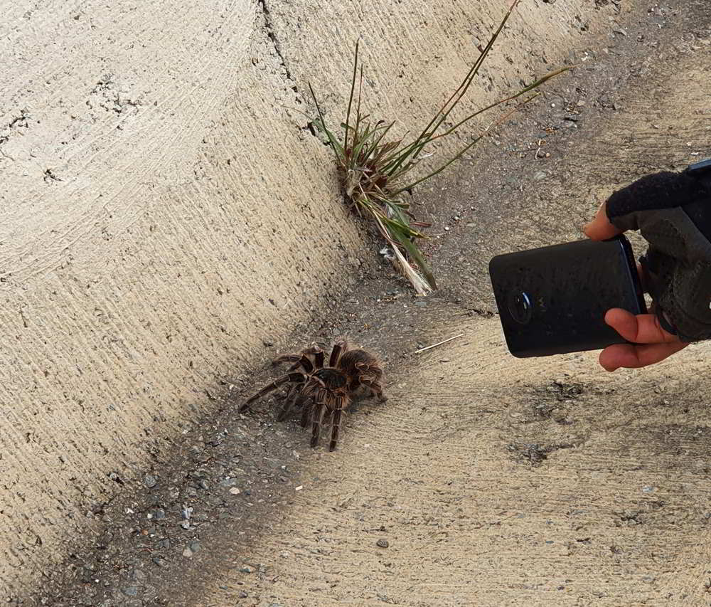 Voltamos a pedalar pelo asfalto da GO-010. Cruzamos o São Bartolomeu por ponte e subimos a forte ladeira de sua margem esquerda. Mais ou menos na metade da ladeira, quando eu subia na frente, vi uma enorme aranha na canaleta pluvial. Era uma tarântula, também conhecida como caranguejeira.