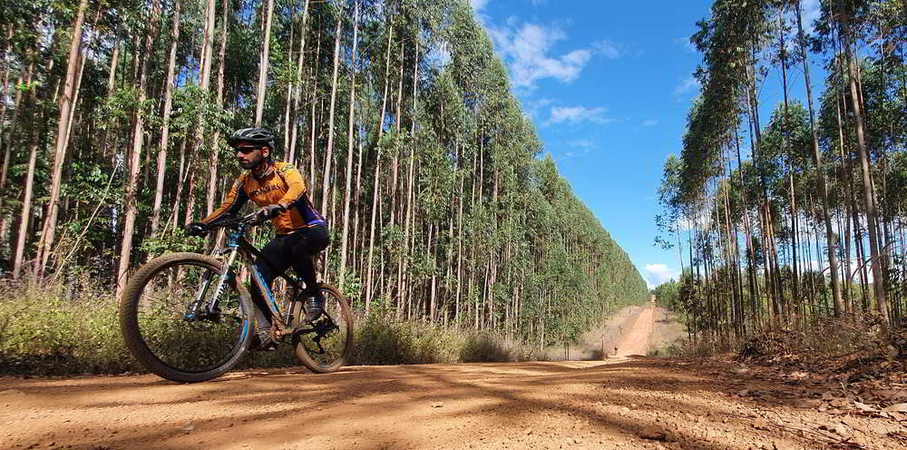 Depois de passar pelo Córrego Lavrinha, adentramos numa área com muitas florestas de eucalipto. Elas formam belos e sombreados trechos muito gostosos de pedalar.