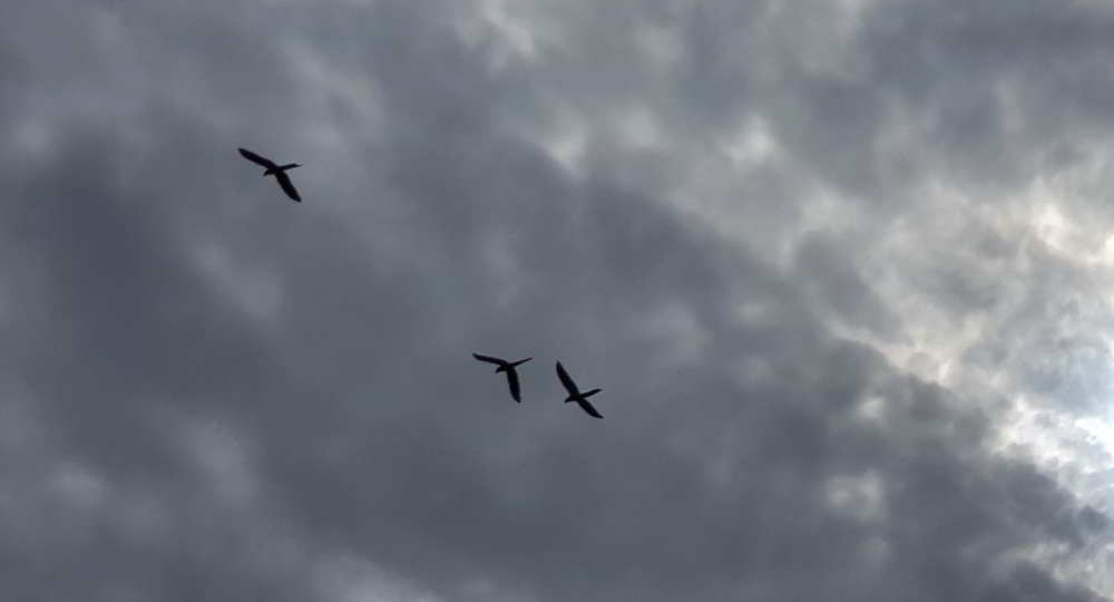 Ao passar sob uma árvore, percebi que havia grandes aves em meio à folhagem. Parei. Era um casal de araras canindés. Elas estavam comendo os frutos da tal árvore, cuja espécie desconheço. Parei para filmar. Elas saíam voando, davam uma volta e retornavam, querendo continuar o banquete, mas incomodadas com minha presença, voavam novamente. Fizeram isso várias vezes, até que desistiram e foram para outro lugar. Nisso, Evaldo e Alexandre alcançaram-me. Eles queriam esperar o resto do bonde, mas eu não podia ficar muito tempo parado por causa do pneu. Segui em frente.