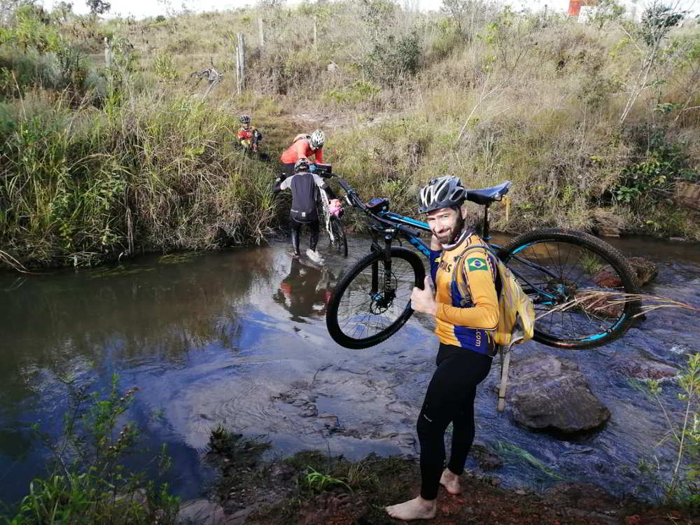 Do outro lado, atravessamos a mata ciliar e seguimos por single tracks em meio ao capinzal. Mais setecentos metros e chegamos ao Córrego Taquara onde fizemos a segunda travessia. O Taquara tem o leito pedregoso e forma pequenas quedas d’água no local da travessia. As pedras estavam um pouco escorregadias, mas não foi problema atravessar com água nas canelas.