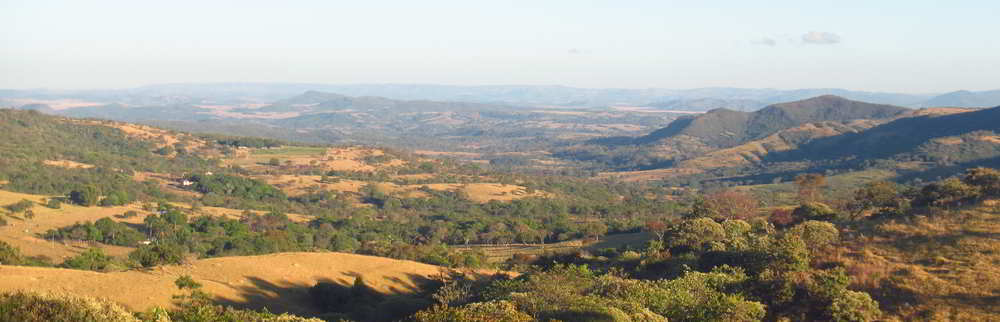 Morros cobertos de mata entremeados por propriedades rurais, estradas de terra atravessando os vales.
