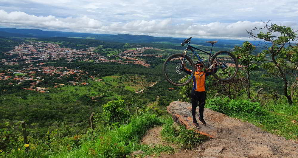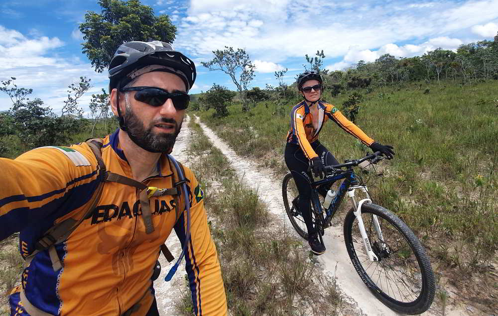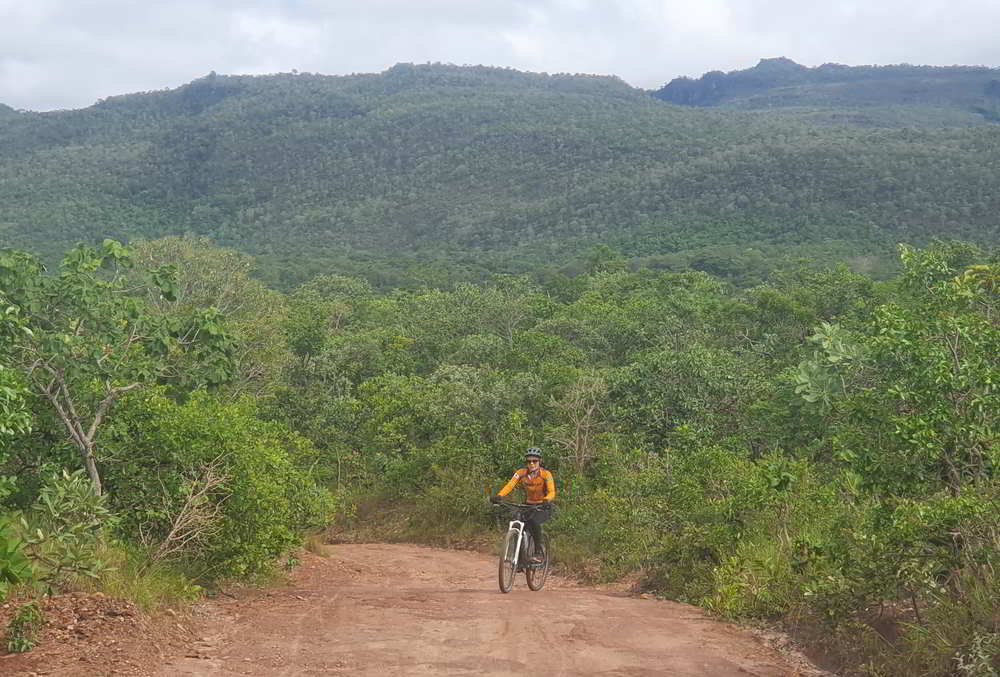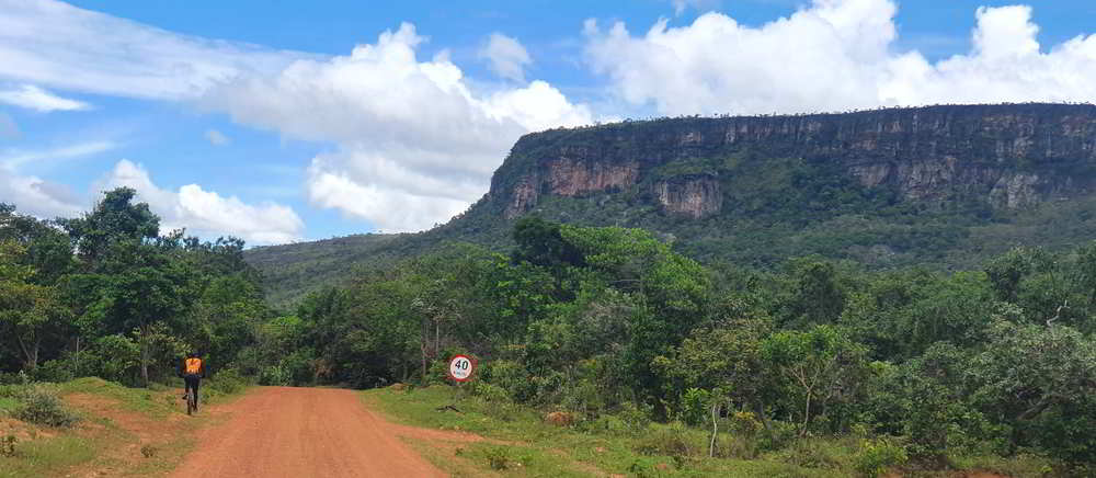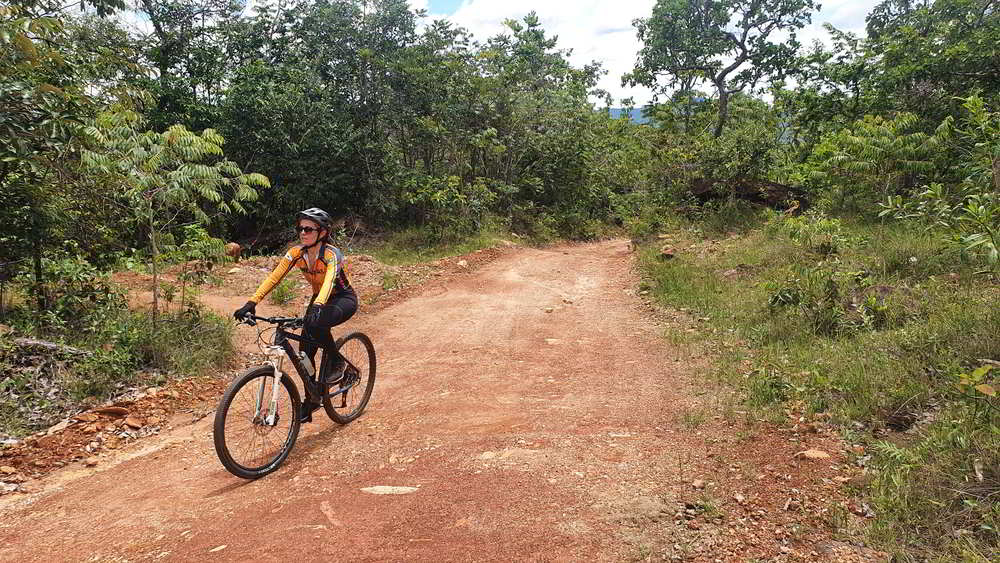 Visita concluída, fizemos o caminho de volta até a estrada. Daí pintou uma dúvida. Se voltássemos para a cidade, nosso pedal seria muito curto, então propus a Leidiane que alongássemos o trajeto, transpondo a Serra do Pedro até a BR-070, e de lá voltássemos por algum outro caminho. Ela relutou um pouco, afinal, não tínhamos trazido muito alimento, nem muita água, mas concordou. Eu avisei: “Vai ter single.” Mesmo assim, ela topou. É isso aí! Temos que enfrentar nossos medos.