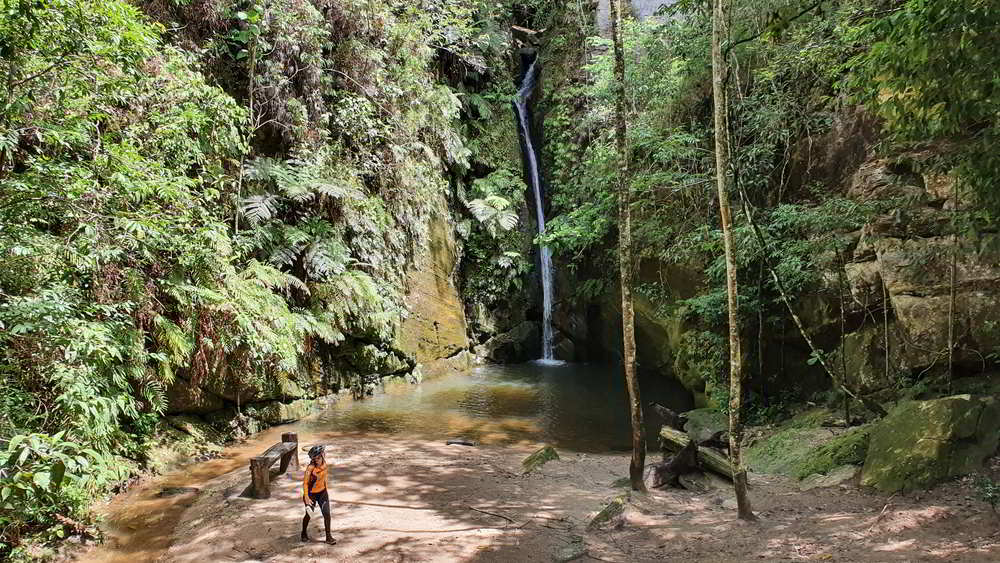 Depois de alguns minutos de contemplação, retornamos para a estrada do Frota e continuamos até a Cachoeira do Macaco. Apenas 2,5 quilômetros até a entrada. Conversamos com o caseiro da propriedade que nos indicou o caminho. A estradinha adentra na floresta, passando por trechos muito agradáveis, até chegar à área da cachoeira.