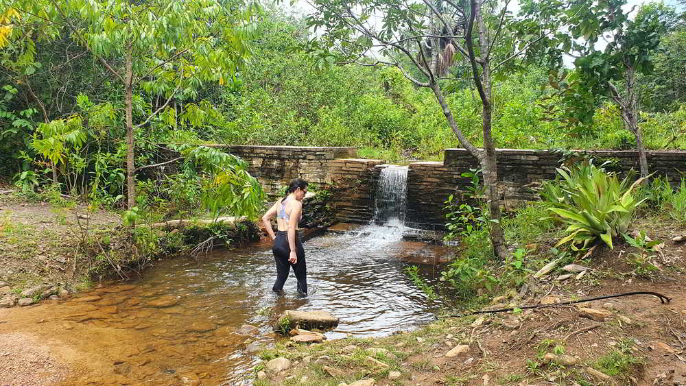 Quase no final desse caminho, há uma vereda cujas águas cruzam a estradinha. Fizeram uma pequena queda d’água artificial no local, de pouco mais de um metro de altura. Aproveitamos para aliviar o calor, tomando um banho refrescante.