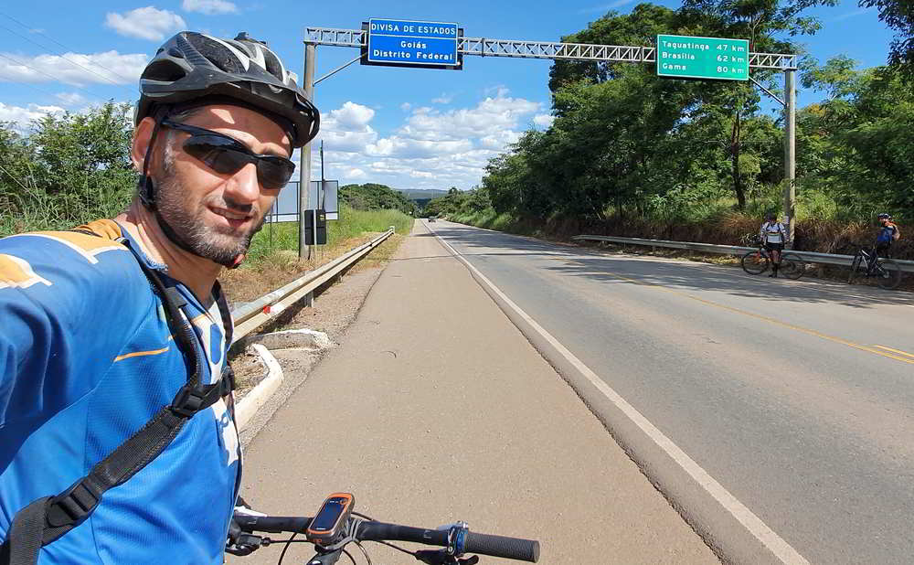 A trilha começou pela DF-205. Oito quilômetros depois do bar cruzamos a divisa e entramos em território goiano, no município de Padre Bernardo. Pedalamos 13,5 quilômetros pela rodovia e comemos muita poeira pois ela não tem calçamento e recebe grande fluxo de caminhões vindos da Mineradora Rio do Sal, que levantam muito pó quando passam.