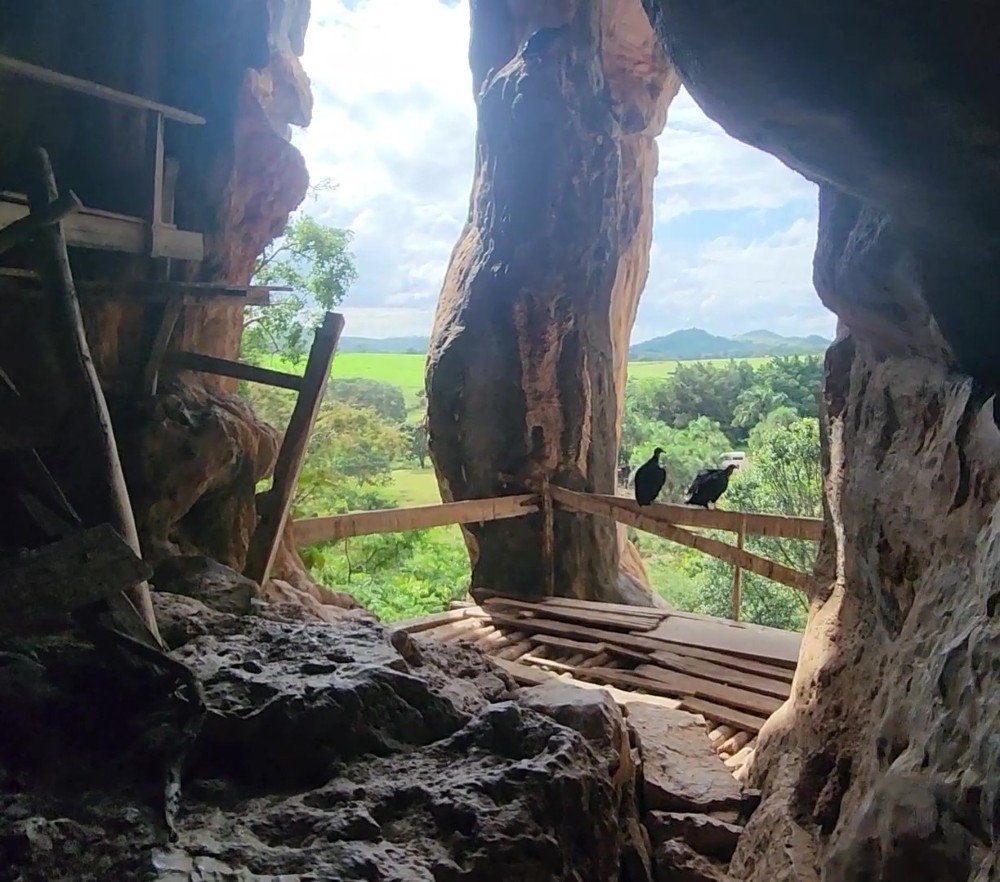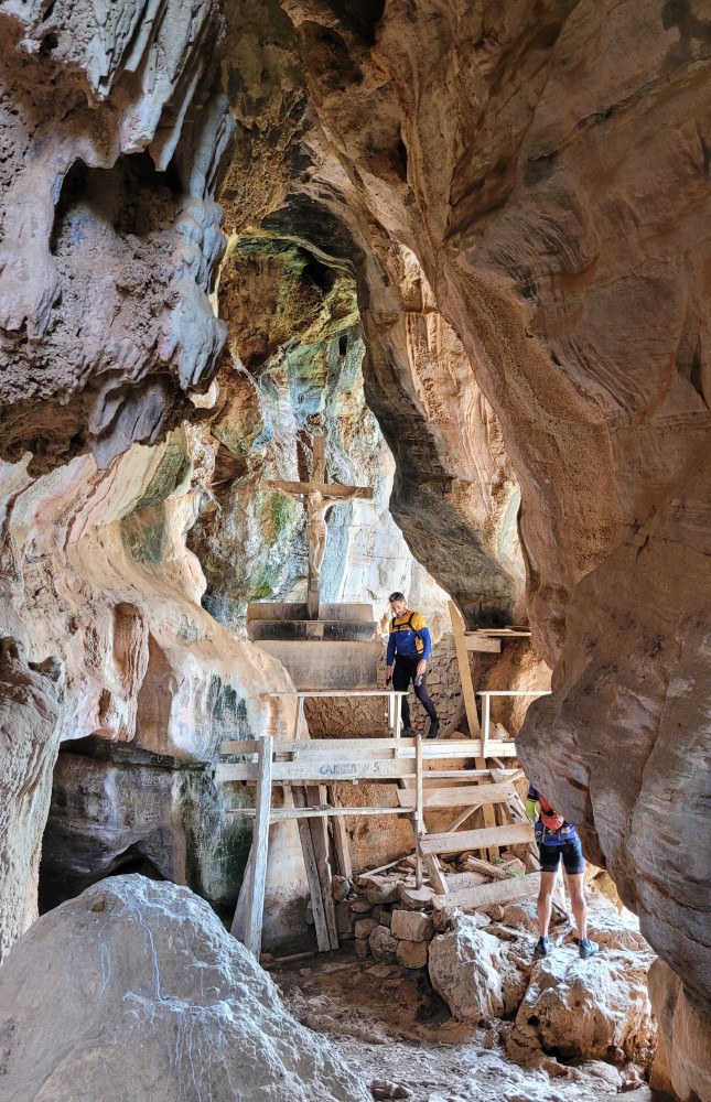 Encontramos o caminho até a gruta superior. Quando eu cheguei, vários urubus saíram voando. Nela há um altar de madeira com uma grande imagem de Jesus crucificado. Construíram escadas e paredes de pedra e uma plataforma de madeira com vista para o leste permite observar o movimento na estrada. A boca do salão superior é bem alta e está dividida por uma enorme coluna de rocha que vai do chão ao teto.